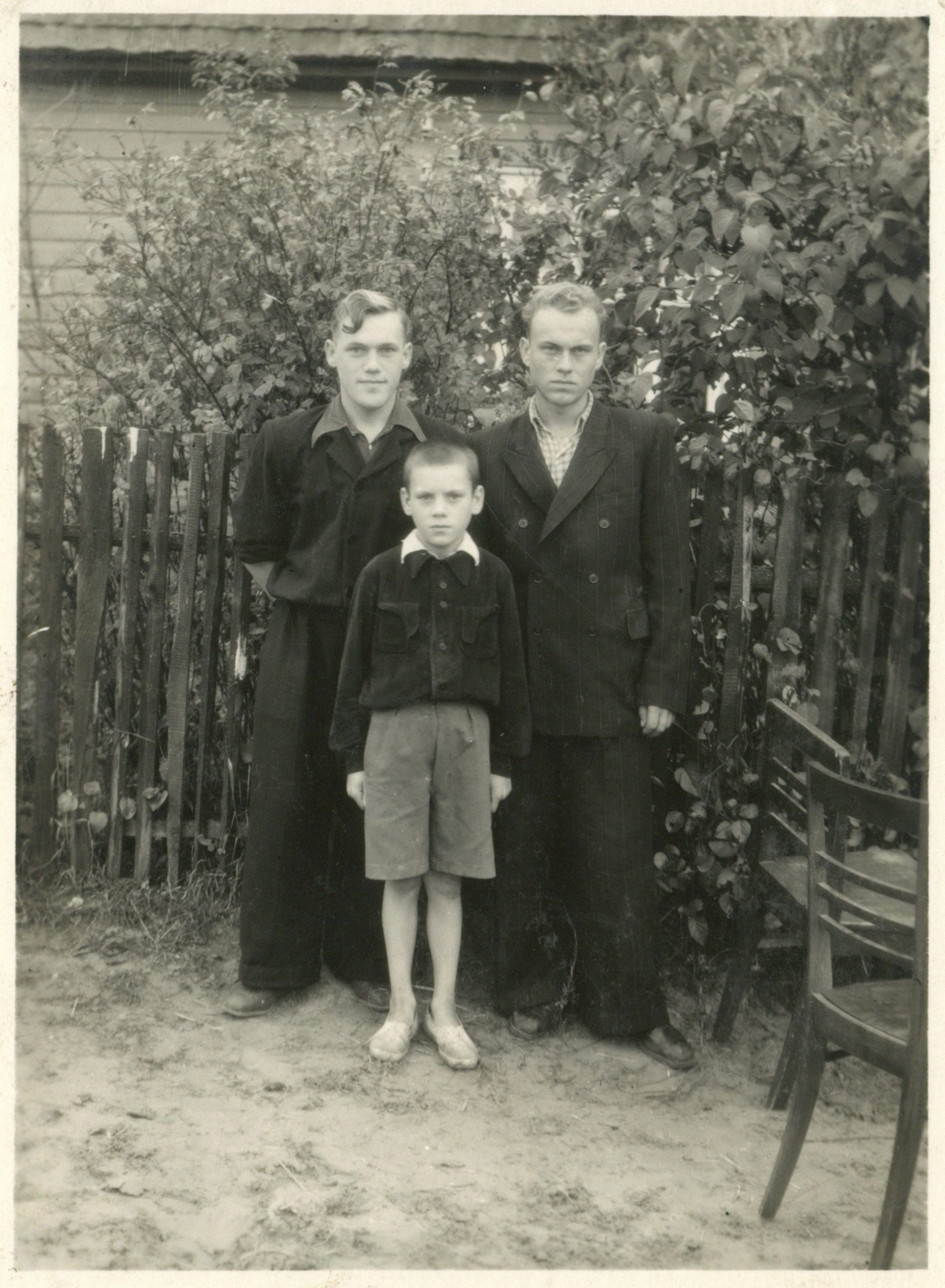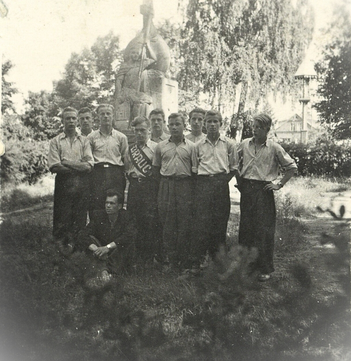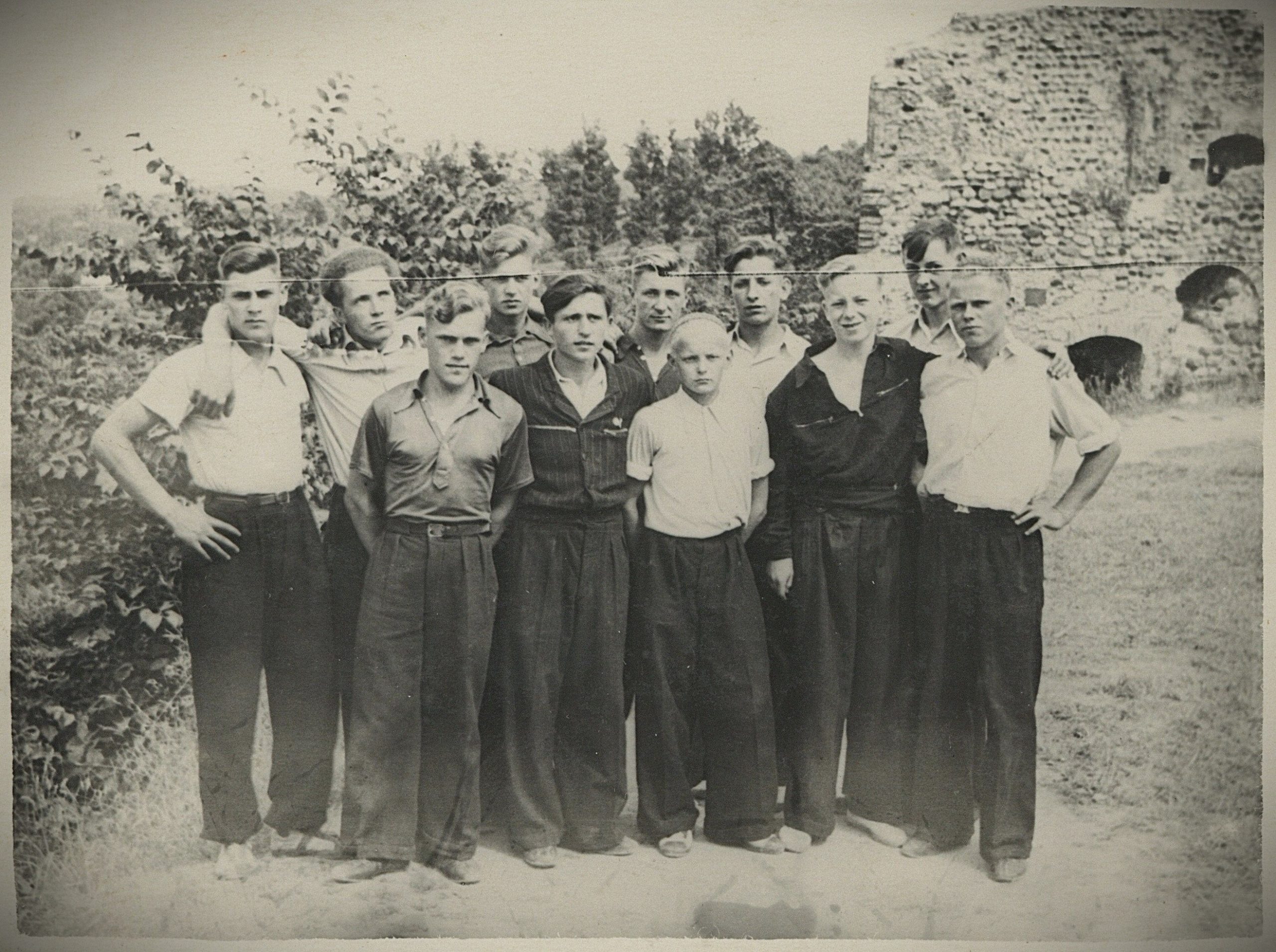 L. K. Ulevičius (stovi viduryje) su klasės draugais Kazlų Rūdos miške žiemą. 1954 m. Fotografija iš Lietuvos švietimo muziejaus rinkinių.